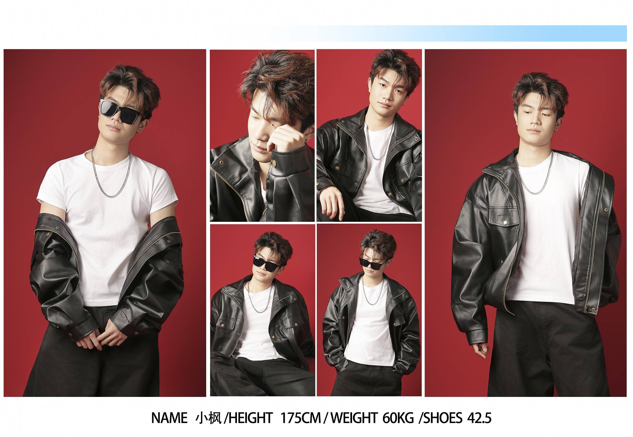 当他换上 oversize 黑色皮夹克,搭一件洗得软透的白 T,气质像被按下了 “鲜活键”。皮夹克的硬朗纹理,本该是 “攻击性” 的符号,到了小枫身上却成了 “野生松弛” 的注脚:他把夹克随意搭在肩头,链条垂在白 T 领口的弧度带着点漫不经心的晃;墨镜推在发顶时,额角的碎发扫过眉骨,像刚从街头篮球场跑下来的少年,带着点汗湿的随性,却又在抬手整理领口时,露出腕骨的清瘦线条 —— 那是少年感独有的矛盾:既带着未被打磨的野,又藏着不自知的柔。