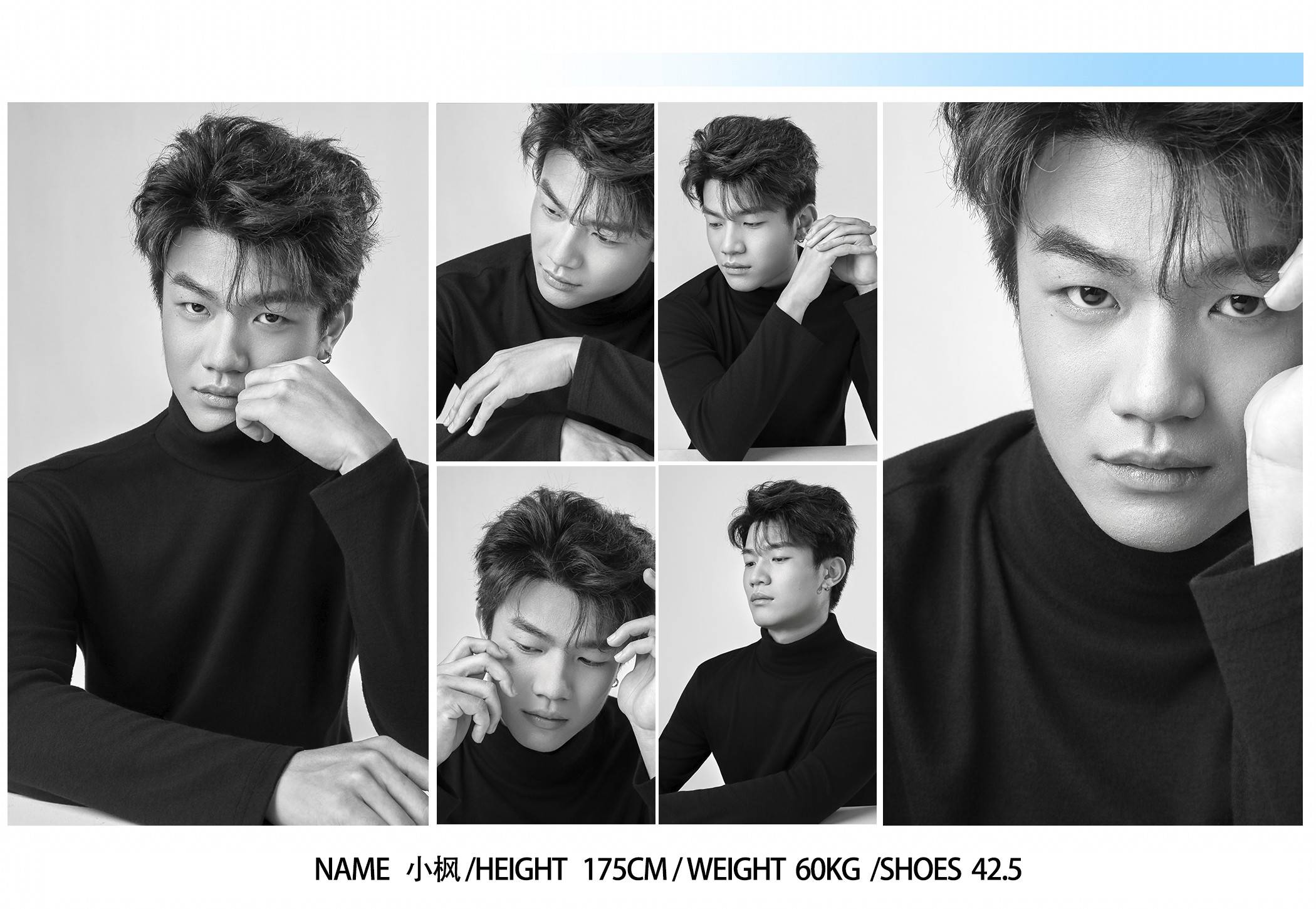 当镜头对准小枫的那一刻,你会忽然明白:新人模特的珍贵,从来不是复刻某种 “标准”,而是让每一件衣服,都长出独属于他的温度。作为领尚艺术最新签约的面孔,这个身高 175cm、肩线清瘦的少年,像一块刚被晨光晒透的棱镜 —— 黑高领的沉静、皮夹克的野生、西装的轻熟,都成了折射他特质的光,在镜头里漫开 “不被框定” 的鲜活。