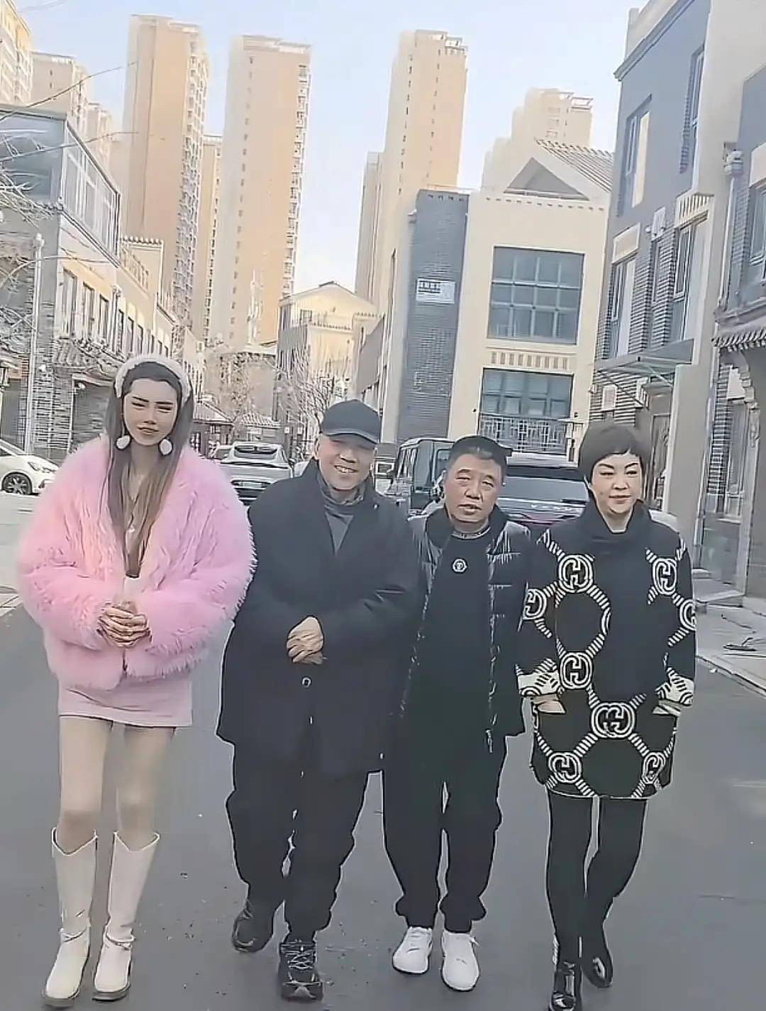 女网红个子高、颜值也不差。但这一身粉衣,有一种很土气的感觉。不过站在穿黑袄子的杨议面前,还是美得醒目。