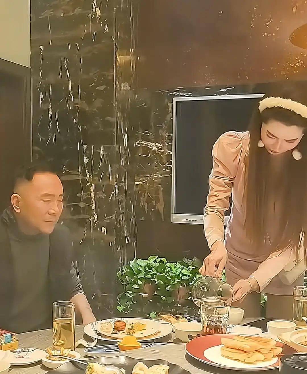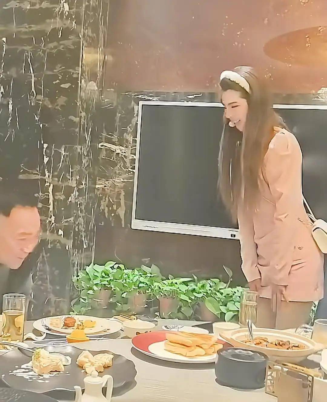 一行人来到酒店包间后,网红美女开始给杨议敬酒。美女脱下粉色皮草外套、身材很苗条,看起来高高瘦瘦的,不说她43岁还真看不出来。