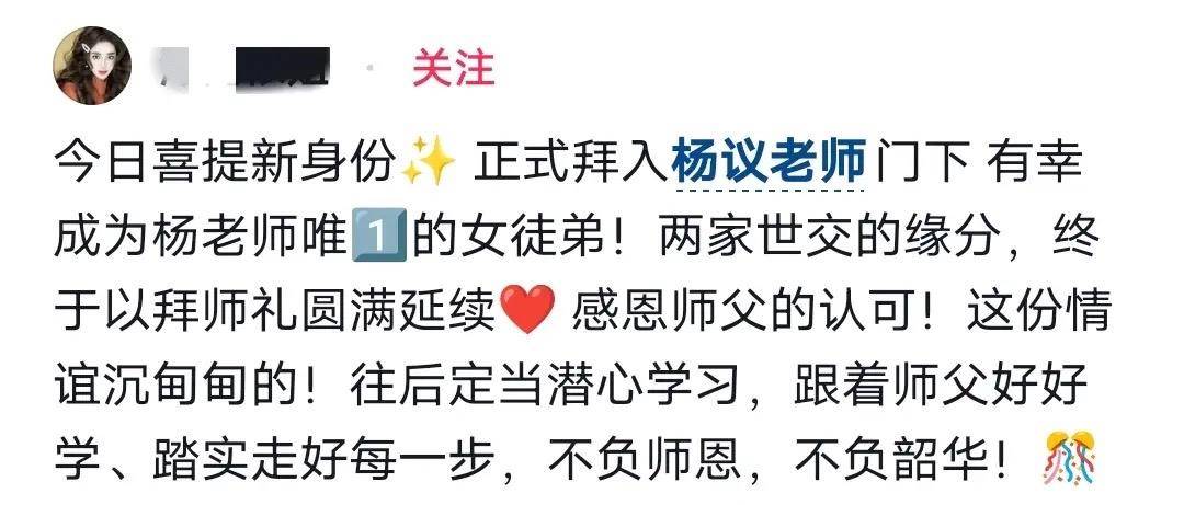 看到这里就会想到杨议让老婆“三姐”同吃同住的往事,父亲离世才5个月,这就有如此高调的收女徒弟,真怕是晚节不保了。