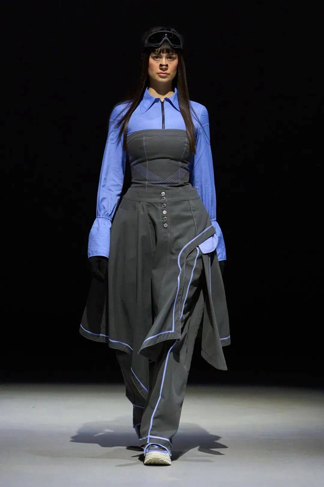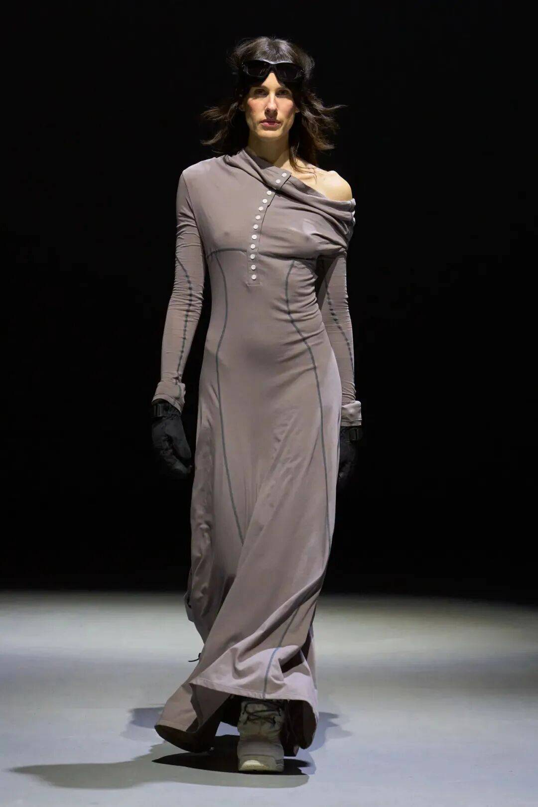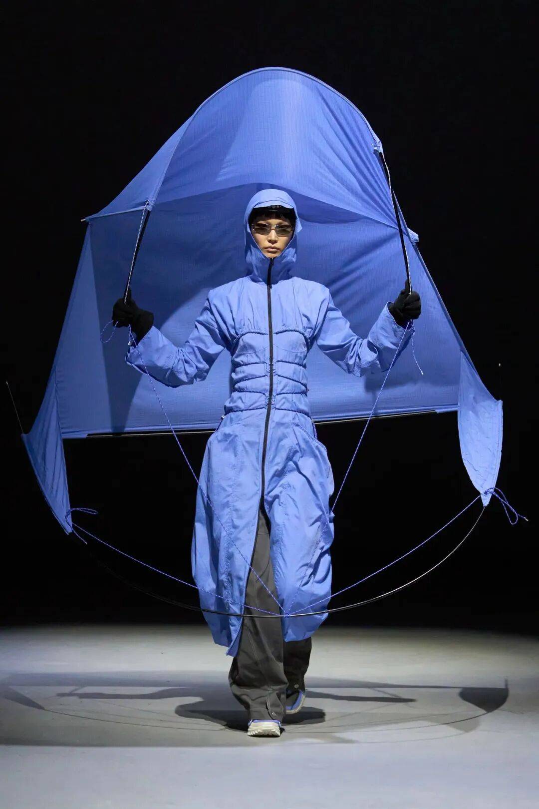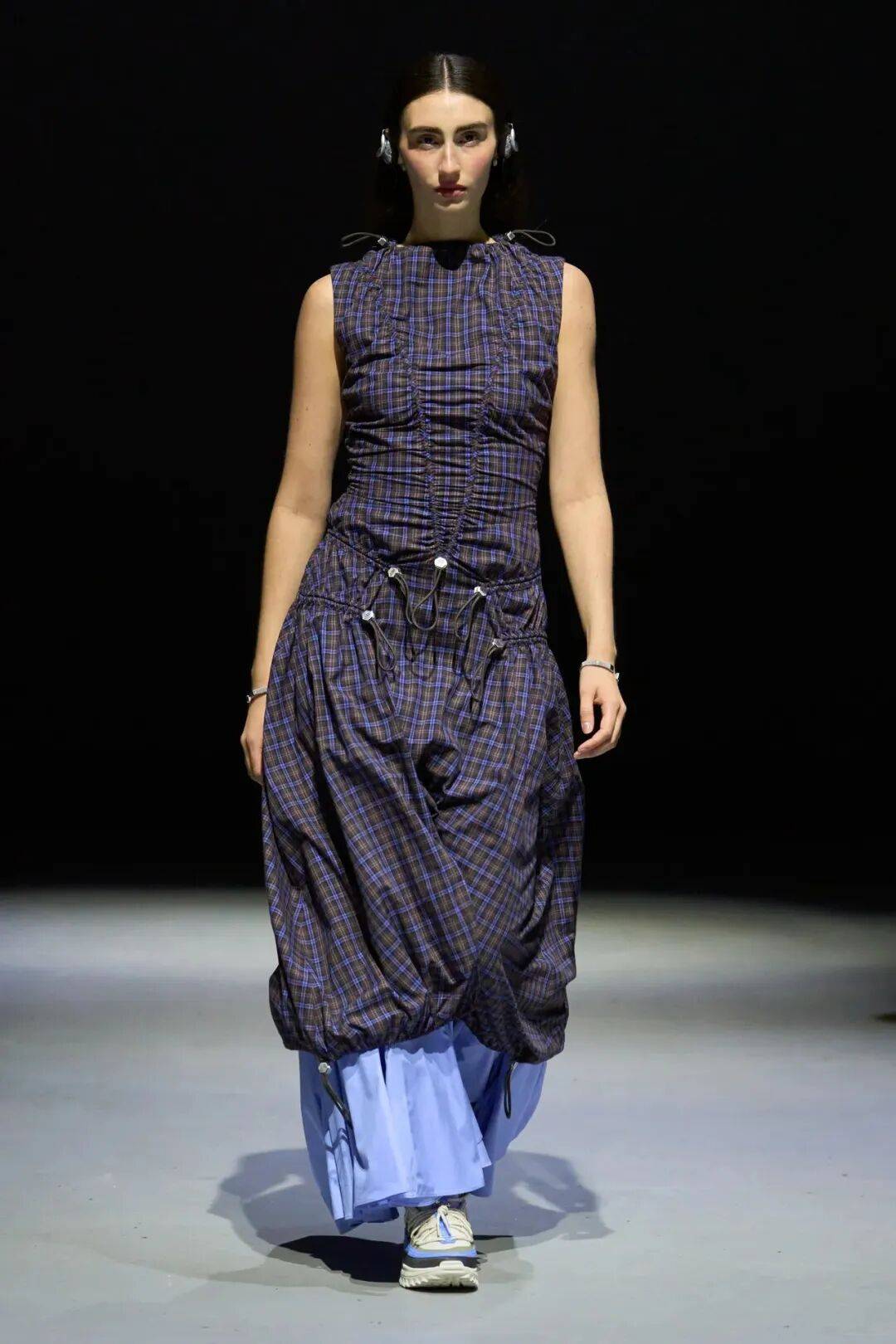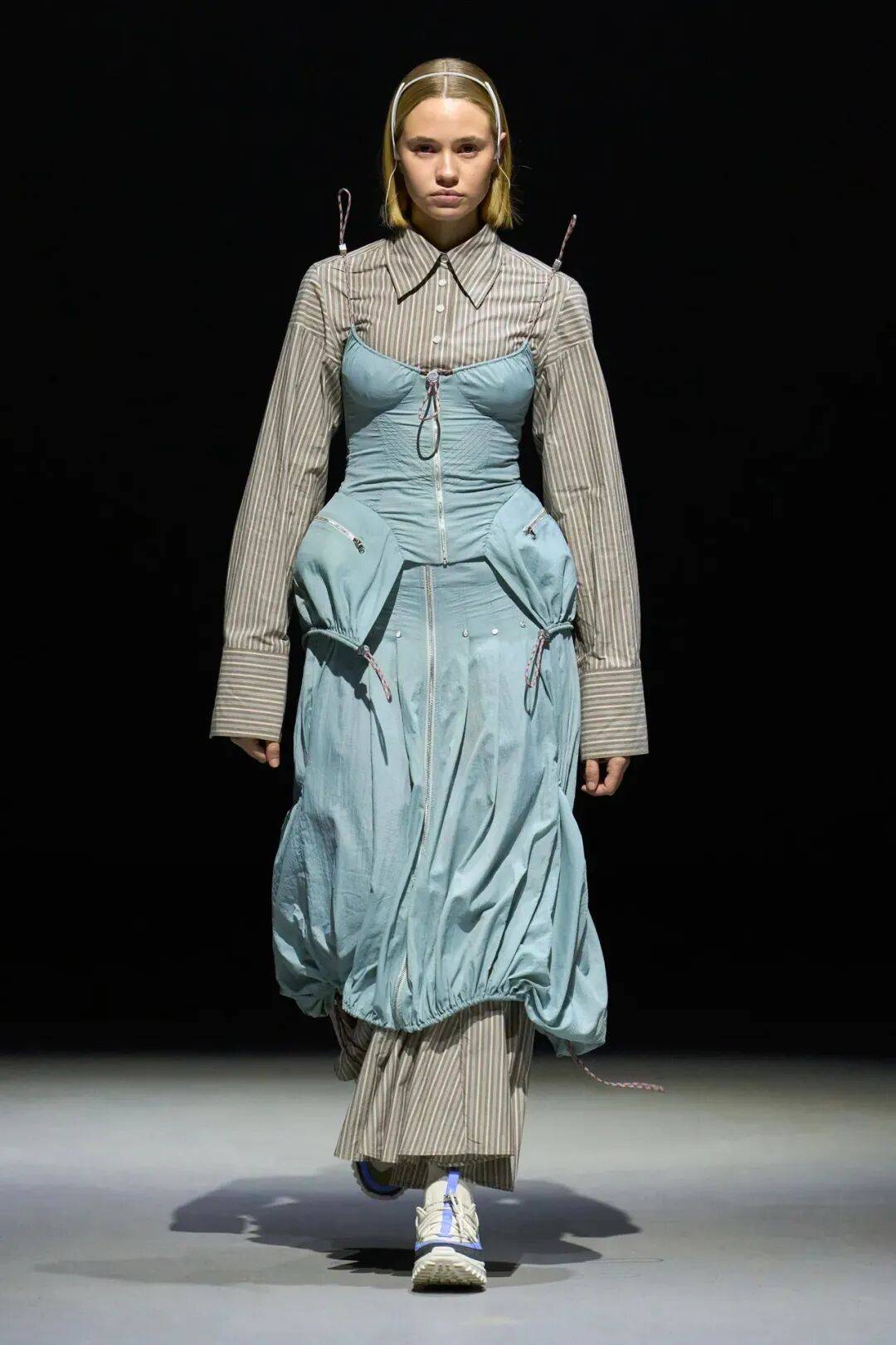 •巧思的雕塑:一件水青色尼龙连衣裙成为秀场亮点。抽绳设计被巧妙用于同时完成身形勾勒与袖摆、裙裾的体积塑造,功能性与装饰性完美统一。而内置帐杆的尼龙紧身胸衣,则将户外装备的结构精髓转化为颠覆性的身体廓形,堪称智性巧思。