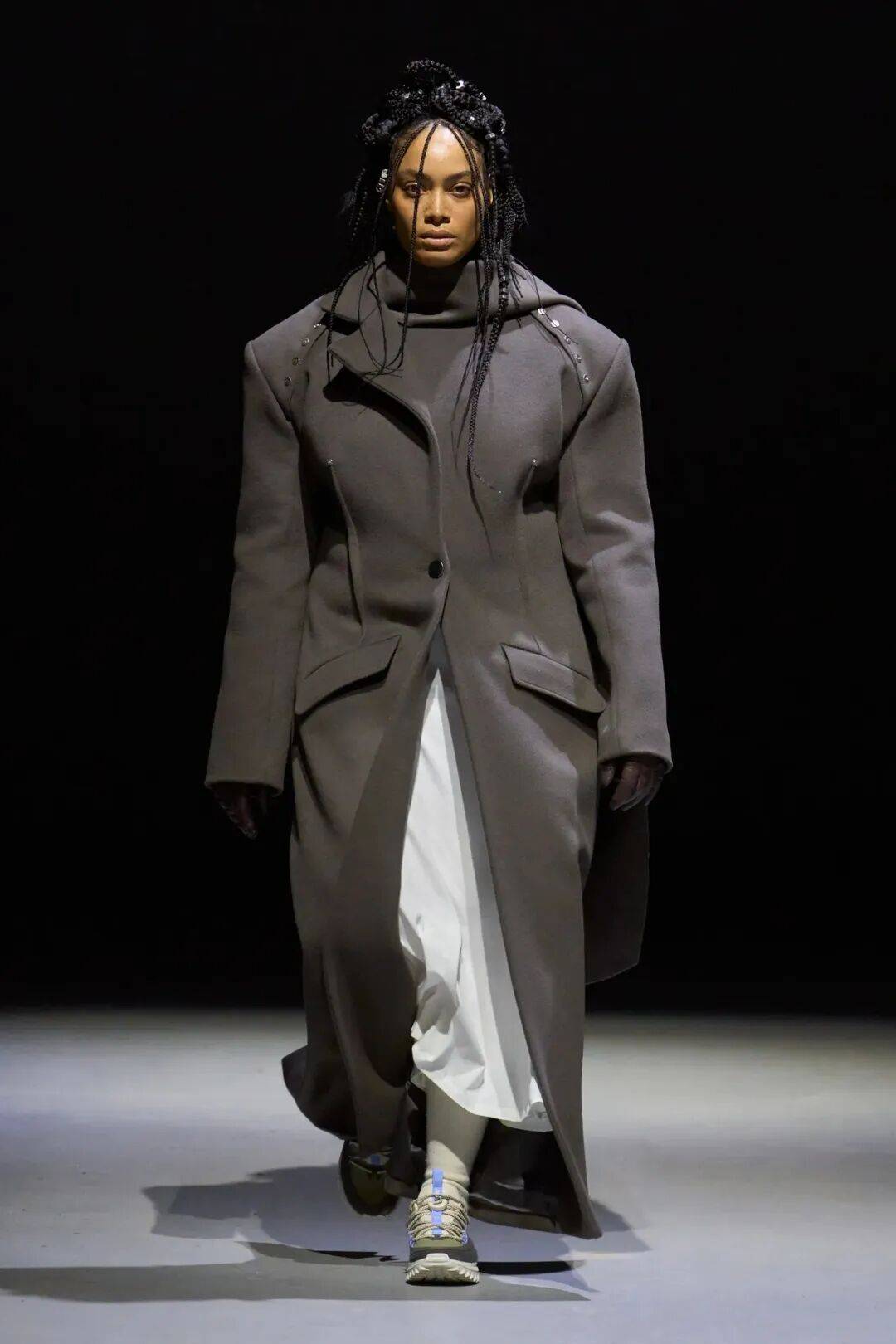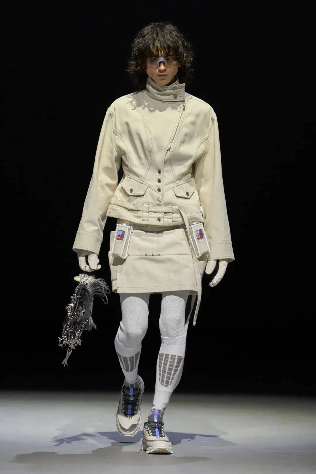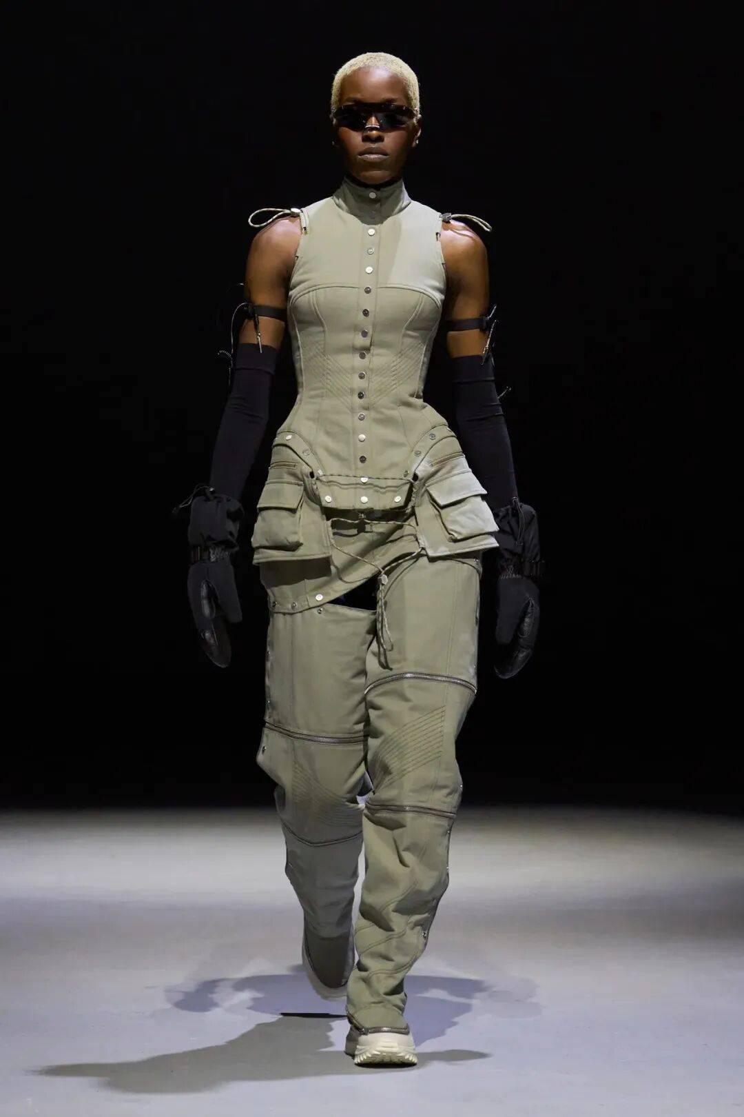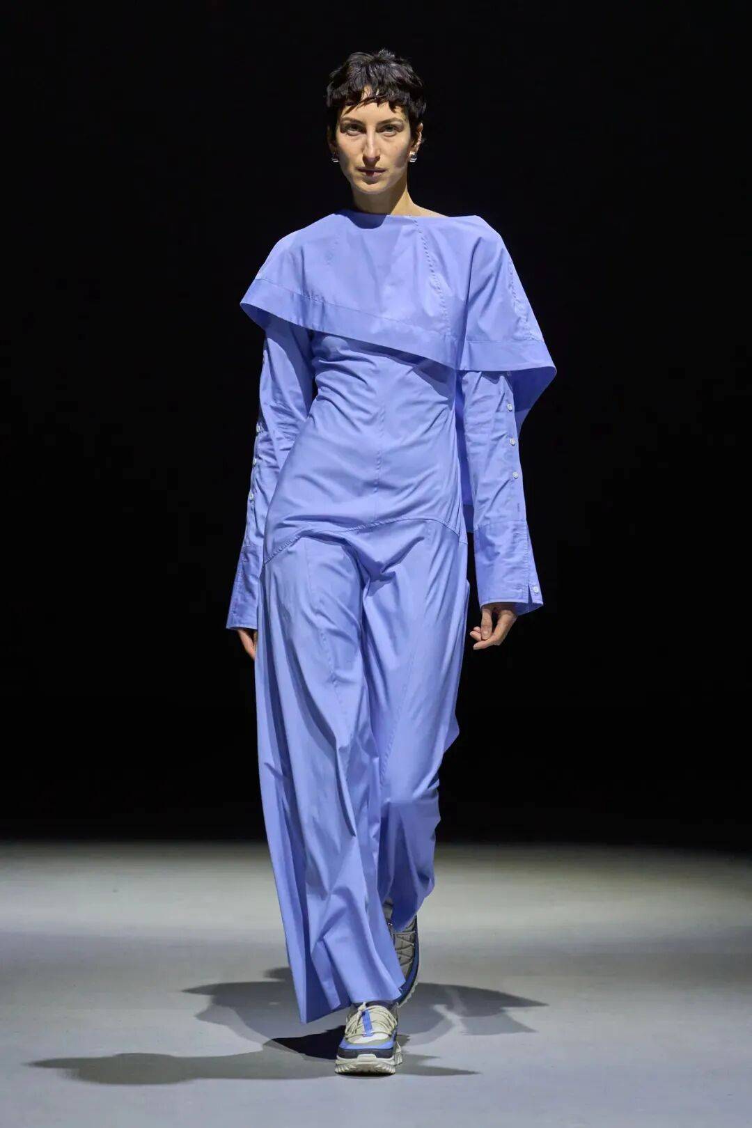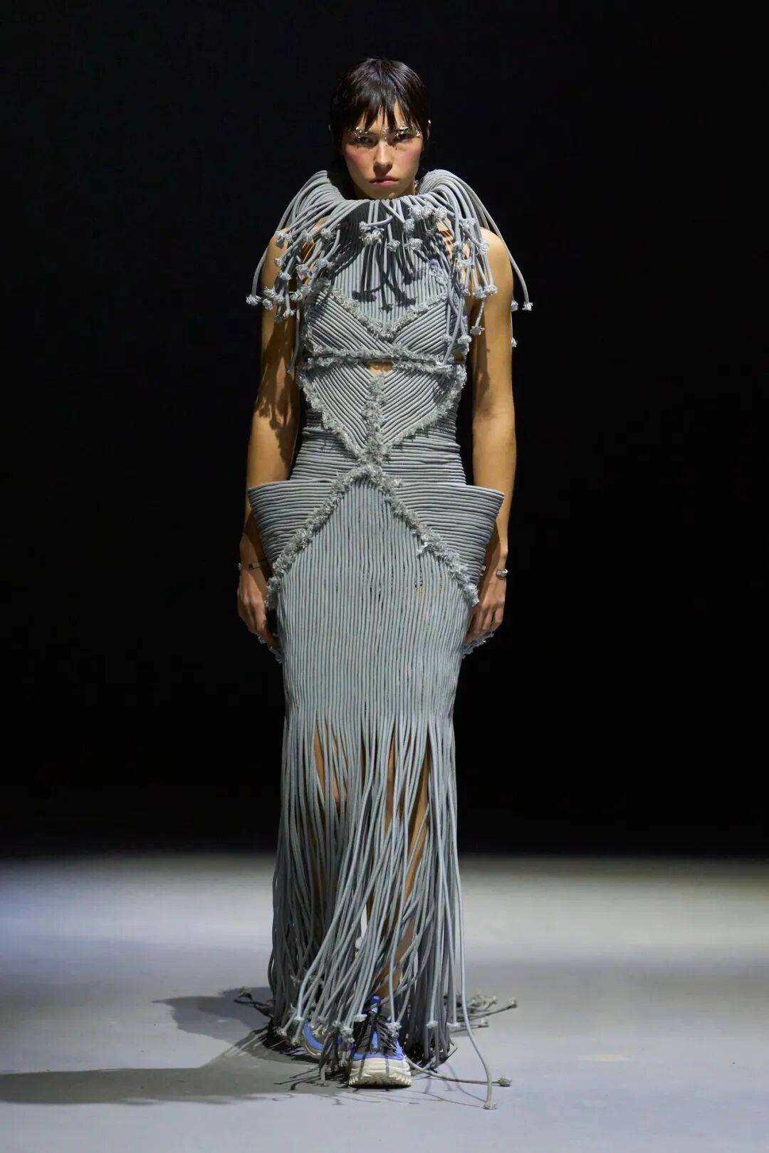 •巧思的雕塑:一件水青色尼龙连衣裙成为秀场亮点。抽绳设计被巧妙用于同时完成身形勾勒与袖摆、裙裾的体积塑造,功能性与装饰性完美统一。而内置帐杆的尼龙紧身胸衣,则将户外装备的结构精髓转化为颠覆性的身体廓形,堪称智性巧思。