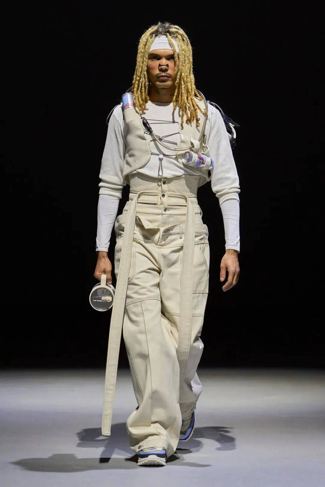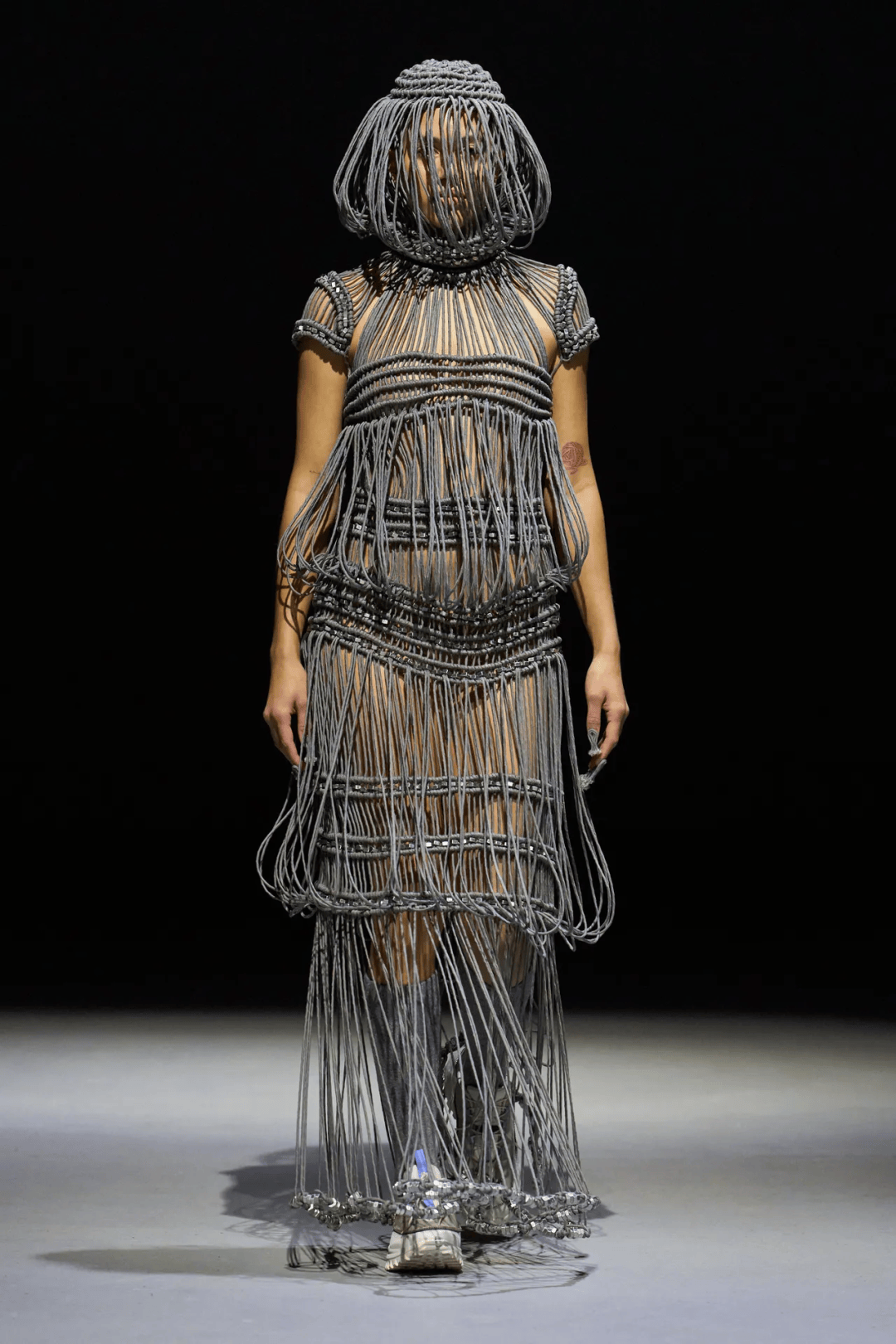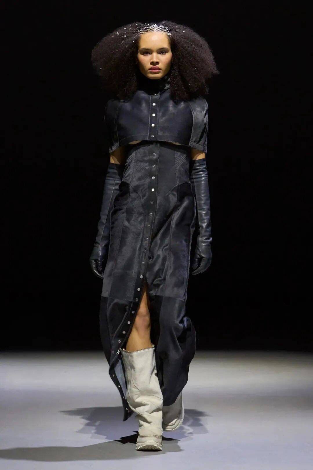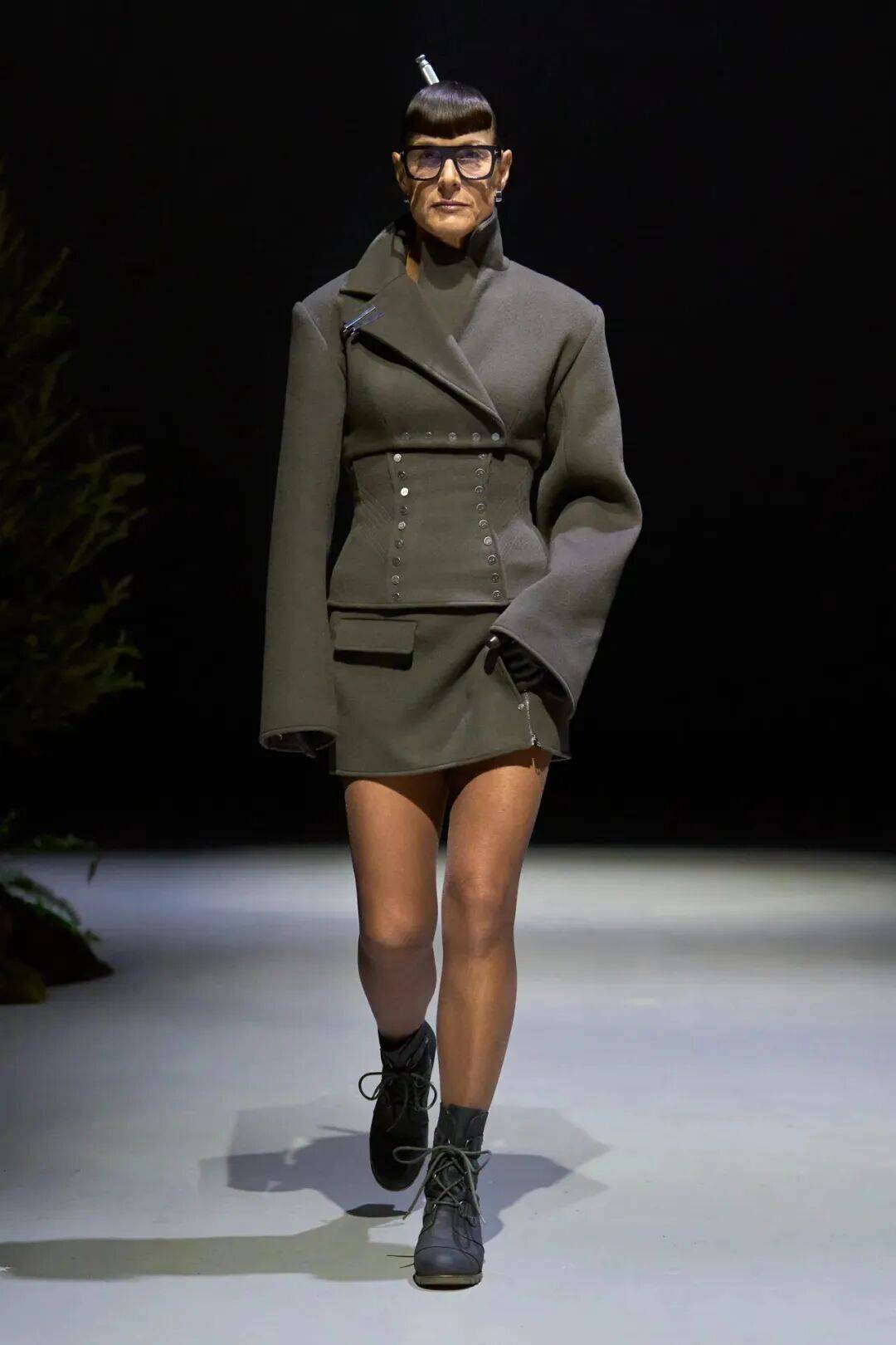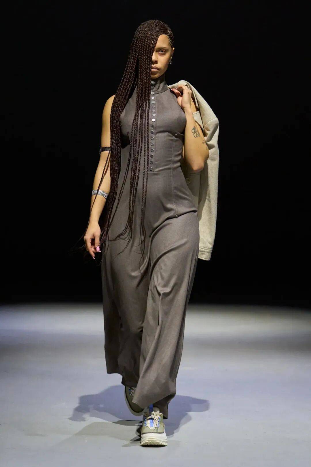•巧思的雕塑:一件水青色尼龙连衣裙成为秀场亮点。抽绳设计被巧妙用于同时完成身形勾勒与袖摆、裙裾的体积塑造,功能性与装饰性完美统一。而内置帐杆的尼龙紧身胸衣,则将户外装备的结构精髓转化为颠覆性的身体廓形,堪称智性巧思。