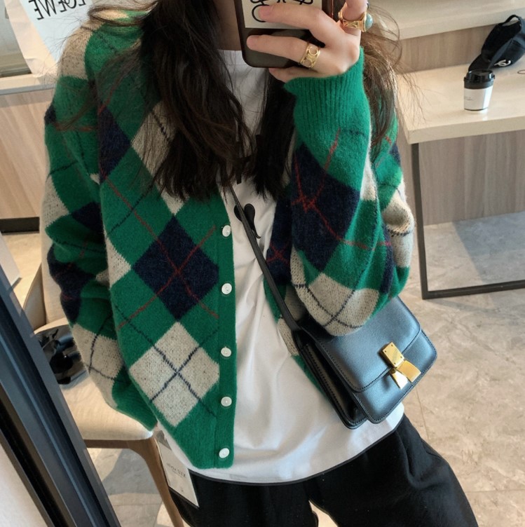 深绿色的针织衫,更加知性内敛一些,饱和度比较高,明度不是太高,也是一种很容易衬肤色的颜色。这样的绿色针织衫,搭配了印花连衣裙,自带优雅风情,显得气质更加典雅大方。