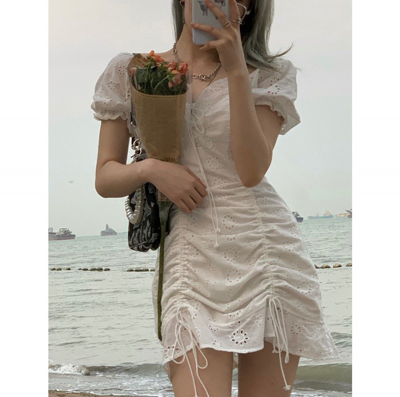 复古优雅蕾丝吊带连衣裙很适合去海边度假的一款连衣裙,精美的白色蕾丝,柔软的刺绣雪纺,两者相结合,给人无限的美感,前长后短的裙摆,刚刚好的优雅,A字形的裙摆设计,在微风的吹拂下,轻轻飘扬,非常迷人。
