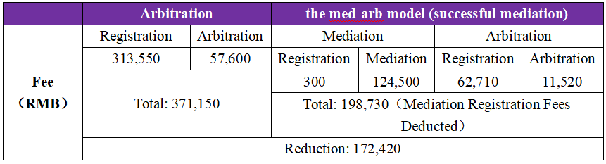 It can be observed that, in the case at hand, the total cost under the med-arb model amounted to RMB 198,730, whereas the cost of proceeding solely through arbitration reached RMB 371,150. This demonstrates a cost reduction of RMB 172,420, effectively cutting the overall expenditure by nearly half. Such savings are particularly significant in the financial sector, where high-stakes disputes often entail complex factual and legal issues requiring extensive procedural resources.