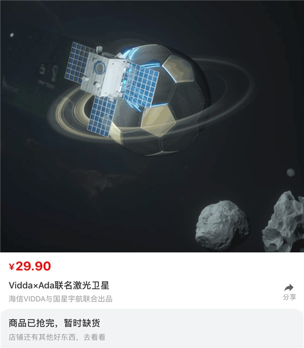 据了解,海信旗下年轻潮牌Vidda在五一假期联合国星宇航推出了一款联名数字藏品,总共发行10000份,每份售价29.9元。4月30日20:00上线后,仅12分钟即被网友抢购一空。而从Vidda官微放出的动画来看,这组数字藏品包含一个完整版的卫星和三个零件。完整版卫星在虚拟的宇宙中运行,并且能在太空中投出有卡塔尔世界杯授权的图像,让这颗卫星像极了一个太空中的投影机。而其中一个激光器零件,更是被网友认为是做实了Vidda即将推出激光投影产品。