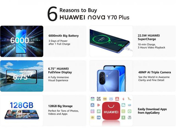 华为 nova Y70 Plus 手机搭载了 6.75 英寸的未知分辨率水滴屏幕,前置 800 万像素 f / 2.0 自拍相机,内置 64 或 128GB 的可扩展存储空间,以及支持 22.5W 快速充电,内置 6000 mAh 电池。华为 nova Y70 Plus 搭载了三重后置摄像头系统,一个 4800 万像素 f / 1.8 主传感器、一个 500 万像素超广角、120 度视野和一个 200 万像素深度传感器。