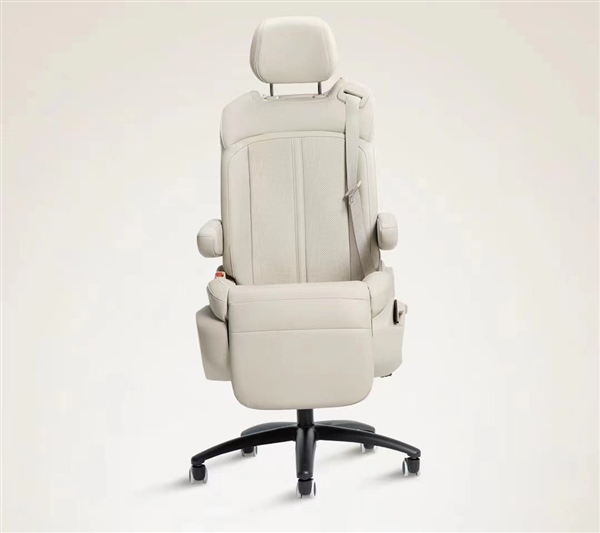 是的,你没看错,造车的五菱造了一把椅子,整体结构和常见的办公室轮带滑轮的椅子差不多,但椅子主体一看就是汽车上的独立座椅,头枕、扶手、腿托一样俱全,而且让人意外的是,竟然还配有安全带,这是怕使用者在办公室里“飙车”吗?