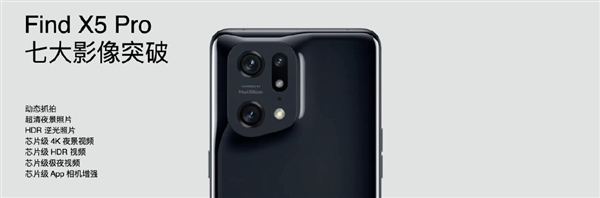 OPPO Find X5 Pro影像硬件上采用三摄组合,分别为5000万像素主摄+5000万像素超广角+1300万像素长焦镜头,通过自研芯片能实现动态抓拍、超清夜景照片、HDR逆光照片、芯片级4K夜景视频、芯片级HDR视频等等。