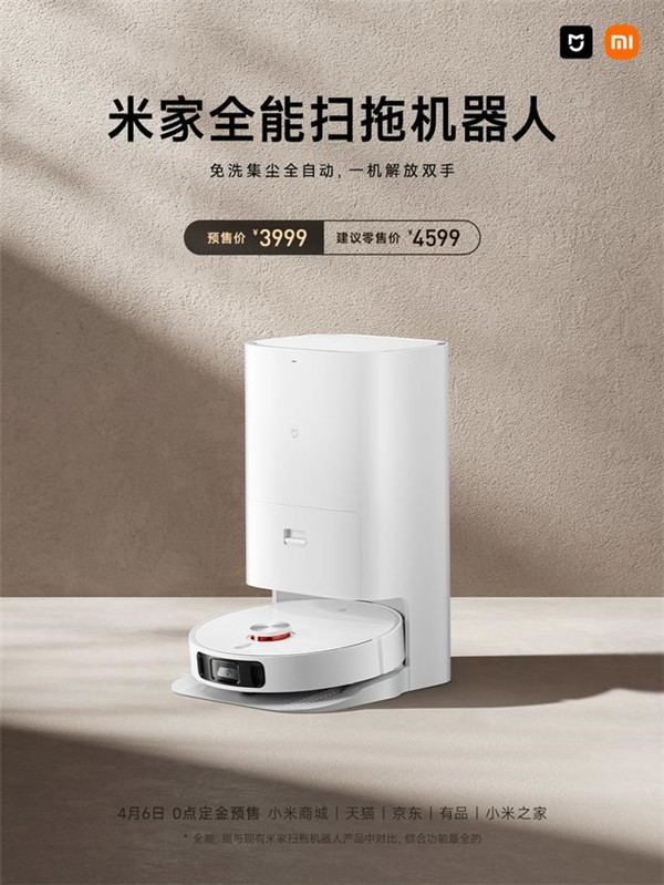 3 月 29 日消息,小米今日宣布推出米家全能扫拖机器人,4 月 6 日首发 3999 元,支持免洗拖布热烘干,自动集尘月抛式尘袋,参数详情仍未公布。