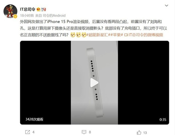 近日,根据数码博主IT总司令爆料,有外国网友做出了iPhone 15 Pro的渲染视频,渲染视频显示,iPhone 15 Pro正面的各种开孔,实现了“真全面屏”。