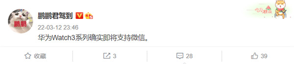 微博博主 @鹏鹏君驾到 也表示,华为 WATCH 3 系列确实即将支持微信。