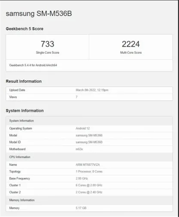 Galaxy M53 5G 近日现身 GeekBench 跑分库,显示该机型号为“SM-M536B”。该机运行联发科的 Dimensity 900 八核 SoC,基础时钟频率为 2.0GHz,配搭 6GB 的内存,搭载基于 Android 12 的 OneUI 4 皮肤。在单核和多核测试中分别获得了 733 分和 2224 分的成绩。