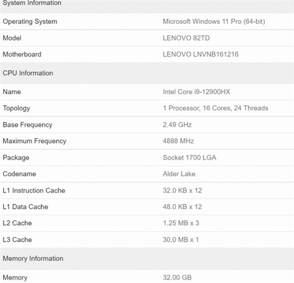 一款搭载酷睿 i9-12900HX 处理器的未知名称的联想游戏本已经在 Geekbench 上进行了测试。外媒表示,这是一款基于桌面 BGA 的 Alder Lake-HX 芯片,拥有 16 核 24 线程(8 大核 + 8 小核)比目前的旗舰 i9-12900HK 更强(后者为 14 核 20 线程)。