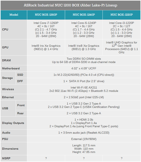 在延续家族式设计语言和外形尺寸的同时,NUC1200 BOX 系列也提供了三款衍生机型,包括 NUC BOX-1260P、NUC BOX-1240P、以及 NUC BOX-1220P(规格如下表所示)。