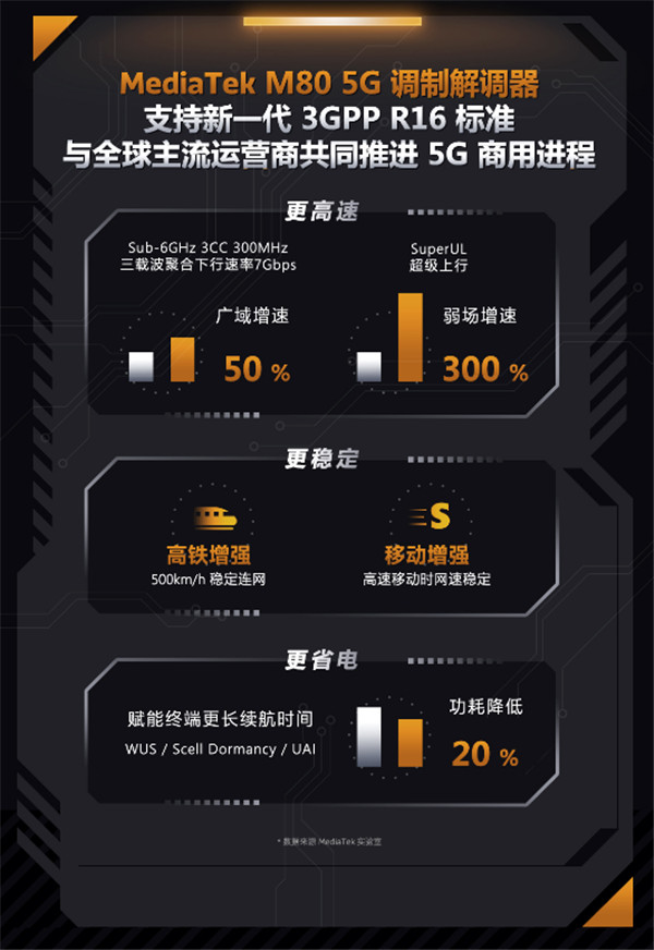 了解联发科的朋友应该对 M80 调制解调器不陌生,它支持 Sub-6GHz 3CC 300MHz 三载波聚合,峰值下行速率可达 7Gbps。在 R16 超级上行特性的支持下,其弱信号环境下增速最高可实现 300% 的提升。针对高铁等快速移动的场景,MediaTek M80 能够在 500km / h 的高速移动中维持信号的速度和稳定,为经常长途出行的用户提供出色的 5G 上网体验。同时,MediaTek M80 有着超乎想象的低功耗表现,在 R16 标准技术下功耗可降低 20%,帮助终端实现更长的使用时间。