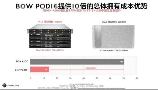对于最先进的计算机视觉模型EfficientNet,Bow Pod16性能比同类Nvidia DGX A100系统提升5倍以上,而价格只有一半,因而总体拥有成本提升高达10倍。