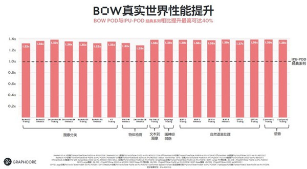 在与配有Bow Pod系统的Mk2 IPU-Pod系统相同的峰值功率范围内,客户发现各种AI应用的性能提升高达40%。