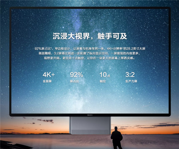 屏幕方面,华为MateStation X配备28.2英寸超大屏幕,分辨率为3840x2560,3:2比例的生产力屏,实现了92%的超高屏占比,同样的尺寸下可以多显示8%的内容,更适合文字阅读、视频渲染等生产力工作。