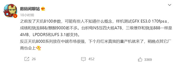 2 月 26 日消息,昨日,数码博主 @数码闲聊站 曝光了联发科天玑 8100 芯片的核心参数。