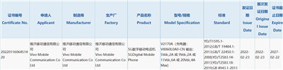 2 月 25 日消息,一款型号为 V2170A 的 vivo 5G 数字移动电话机现已通过 3C 认证,配备型号为 V8060L0A0-CN 的充电器,支持最高 80W 输出。