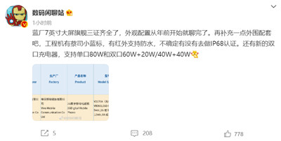 另据数码博主 @数码闲聊站 爆料,这是一款 vivo 的 7 英寸大屏旗舰手机,其工程机拥有蔡司“小蓝标”,支持红外、防水。