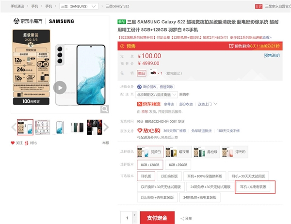 三星旗舰店显示,三星Galaxy S22出厂不标配充电器,参与预售用户加9.9元就能获得三星原厂充电器一个(25W),这是业界第一款没有标配充电器的骁龙8旗舰。