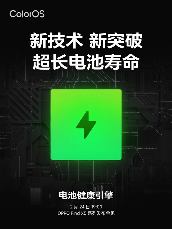 今天,OPPO ColorOS官方微博宣布全新电池寿命延长技术电池健康引擎将于2月24日正式亮相,由OPPO Find X5系列首发搭载。