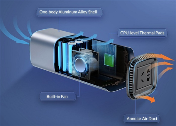 AT150 内置了 15 节锂电池、逆变器、以及采用主动式散热的其它组件(ABS 边缘通风孔),机身主体为铝材。