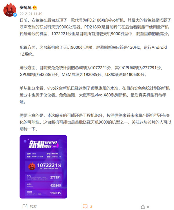 今日,一款代号为 PD2186X 的 vivo 机型跑分成绩出现在安兔兔天玑 9000 机型榜单中,跑分超 107 万。