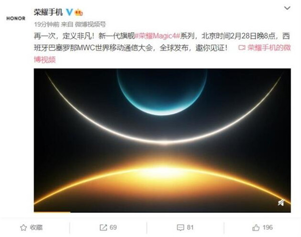荣耀手机在2月16日晚宣布,次世代旗舰荣耀Magic4系列将于北京时间2月28日晚上8:00在西班牙巴塞罗那举行的MWC世界移动大会上全球发布。