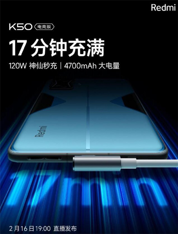 2 月 16 日消息,小米宣布 Redmi K50 电竞版将在 2 月 16 日晚上 19 点发布,带来众多新功能。其中,Redmi K50 电竞版采用 120W 神仙秒充 + 4700mAh 大电量,充满电仅需 17 分钟,还有更厉害的“空中加油”技术。官方放出的海报显示,Redmi K50 电竞版采用了横置的充电方式,方便用户在边玩边充电时更舒服地握持手机。
