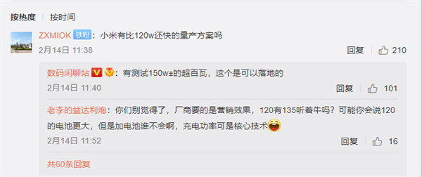 在评论中,该博主还表示,小米还有比 120W 还快的量产方案,有在测试 150W± 的超百瓦,这个是可以落地的。