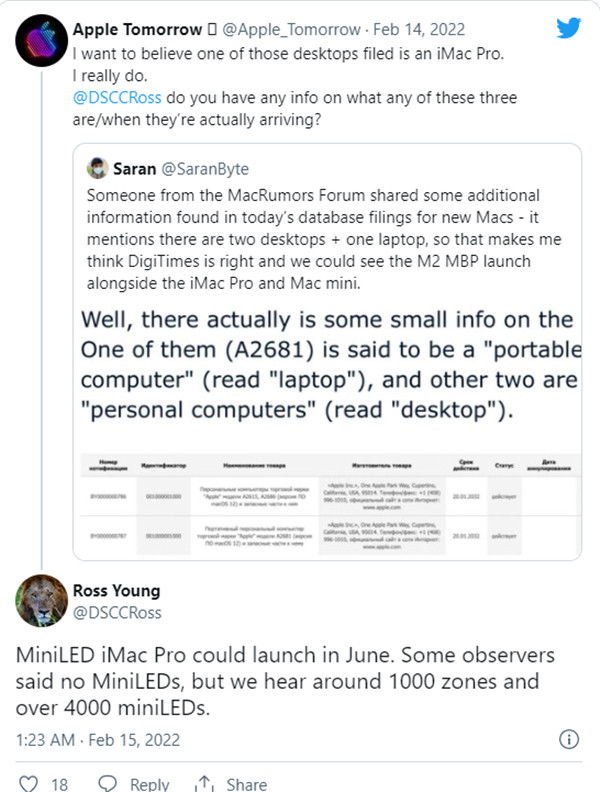 2 月 15 日消息,据 MacRumors 报道,分析师 Ross Young 今天表示,苹果即将推出的配备 Mini LED 显示屏的 iMac Pro 可能在 6 月推出。几个月来,苹果一直在开发大屏幕版的 iMac,如果 6 月的时间表准确的话,它可能会在 WWDC 全球开发者大会上首次亮相。