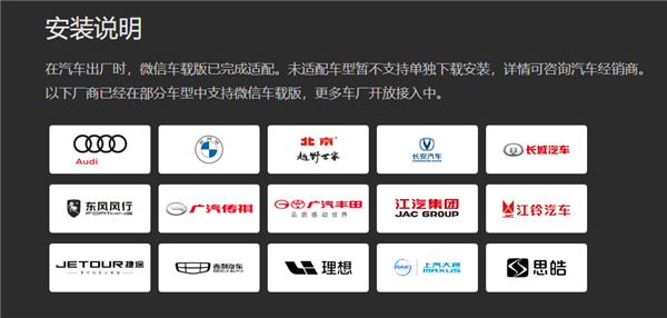 微信称,以上车厂已在部分车型中安装微信车载版,更多车厂开放接入中。汽车在出厂时,微信车载版已完成适配,而未适配车型暂不支持单独下载安装。