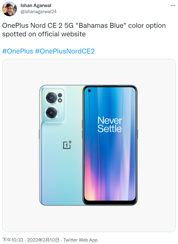 一加即将于 2 月 17 日正式推出 Nord CE 2 5G 智能机,早前官方已经预告了 65W 闪充。今天,该公司更进一步,披露了 Nord CE 2 5G 新机将搭载联发科的天玑 900 芯片组,证实了之前的传闻。与此同时,有眼尖的网友疑似在一加官网上发现了“巴哈马蓝”(Bahamas Blue)配色的照片。