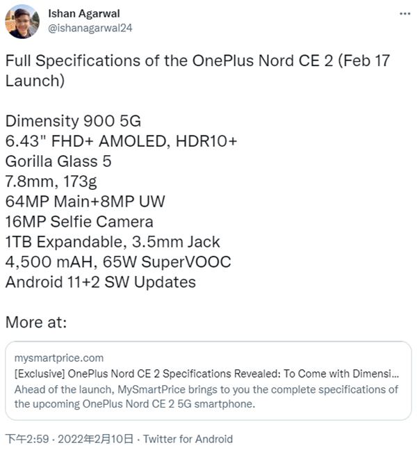 传闻称 Nord 2 CE 5G 会沿用初代机型的屏幕规格和电池容量。