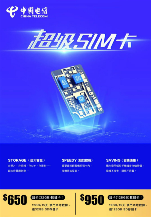 近日超级SIM卡在中国澳门正式上市,率先上市的有32GB和128GB两种容量规格,用户还可以选择中国电信(澳门)推出的“数据卡套餐”,既有大容量也有大流量。