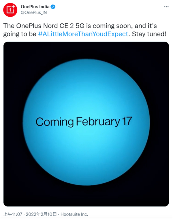 上月,Max Jambor 爆料称一加会在 2 月 11 日推出 Nord CE 2 5G 新机。不过今日,@OnePlus_IN 印度官方账号已在推特上预告了新的日期。推文随附了一条 10 秒钟的动画,期间展示了 Nord CE 2 的部分外观设计,然后将聚光灯达到了“即将于 2 月 17 日到来”的文字上。