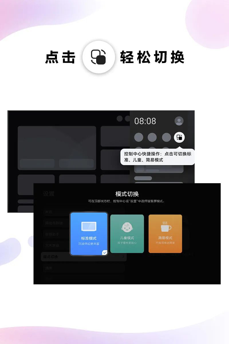 在控制中心可以快捷操作:点击可切换标准、儿童、简易模式。其中标准模式尽享沉浸式体验;儿童模式支持智能管控,养成好习惯;简易模式,支持多种功能一屏即达。