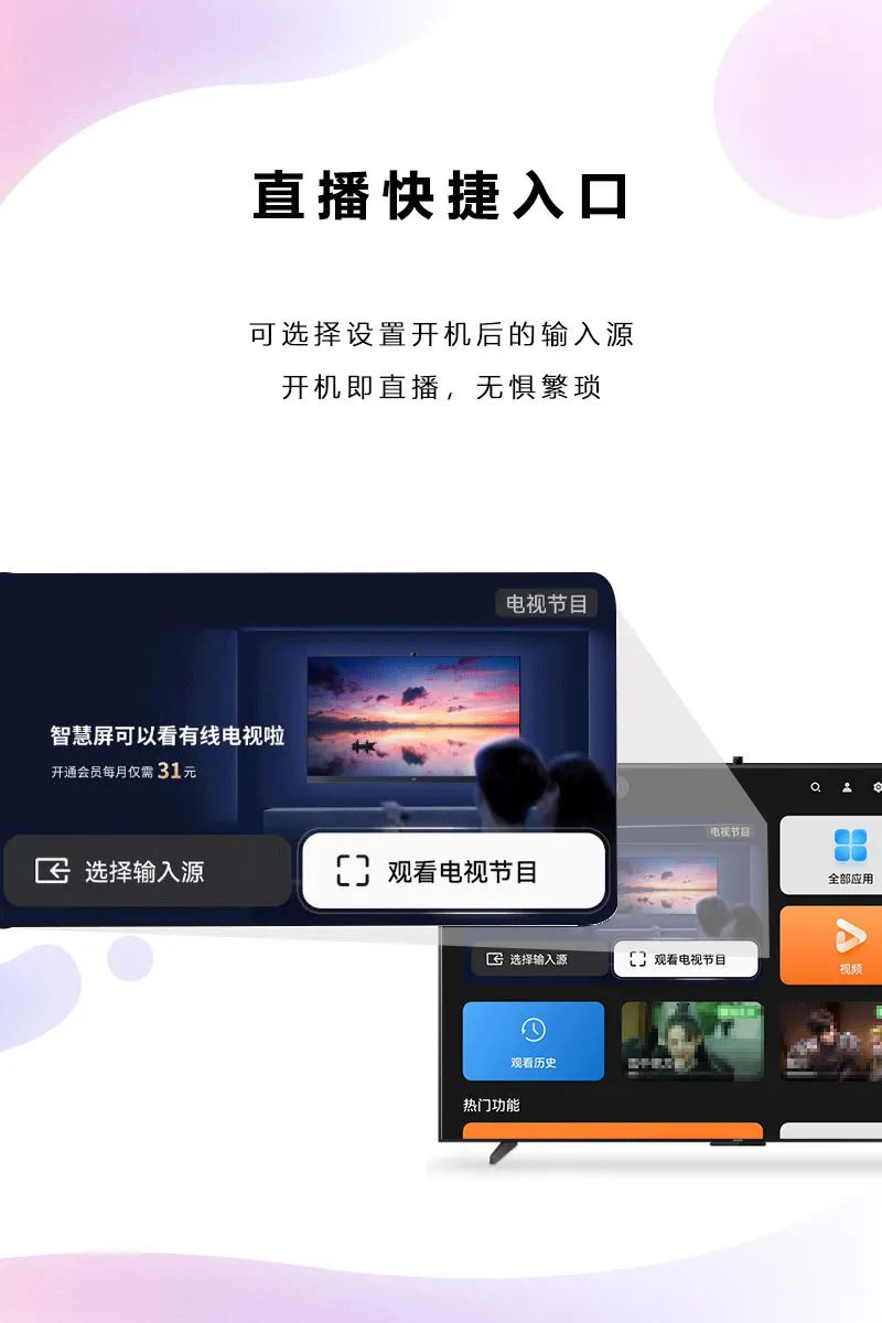 直播快捷入口,可选择设置开机后的输入源,开机即直播,无惧繁琐。