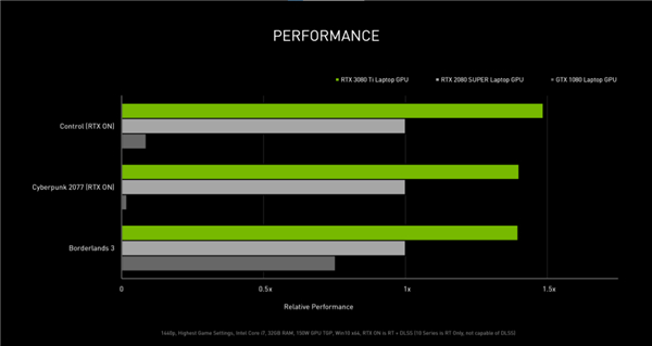 GeForce RTX 3080 Ti 移动 GPU 搭载 7424 CUDA 核心,配备 16GB GDDR6 显存。产品支持在 1440P 分辨率、极致画质下,以 120fps 的帧率进行游戏。官方表示,显卡的性能将超过 TITAN RTX 桌面显卡。