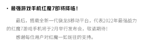 除了向外界传达红魔向元宇宙进军的决心,余航还表示,搭载全新一代骁龙8移动平台,代表2022年最强战力的红魔7游戏手机将于2月举行发布会。
