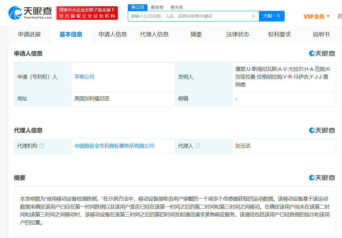 专利摘要显示,移动设备接收用户穿戴传感器获取的运动数据,基于此来确定用户是否跌倒,若用户在随后的特定时间内没有移动,设备则发起通信请求紧急响应服务,通信内容包括用户已经跌倒的指示和用户的位置。