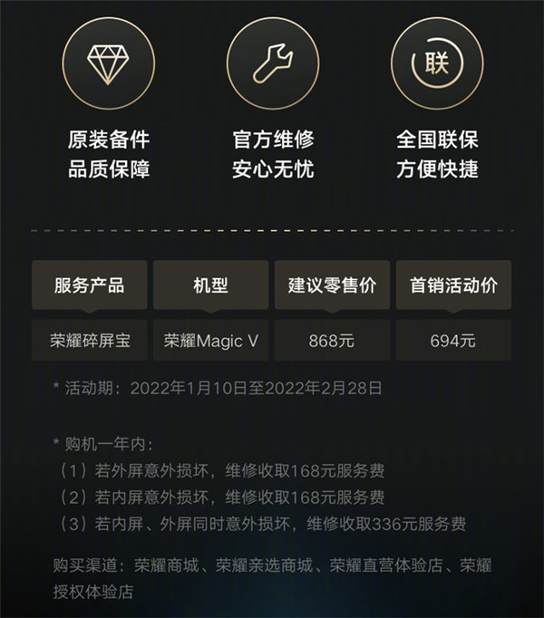 荣耀同时为 Magic V 推出了碎屏保,零售价 868 元,首销活动价 694 元,活动截止到 2022 年 2 月 28 日。购买碎屏保后,购机 1 年内若外屏、内屏意外损坏,将免费更换一次,但需要收取 168 元服务费。若同时损坏,需要收取 336 元服务费。