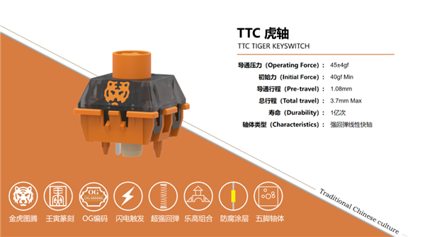 虎年到来,国内按键厂商TTC发布了其首款生肖机械轴:TTC虎轴,配备虎头实体图案,弹簧长度达到了25.5毫米,也是目前TTC最长的弹簧。
