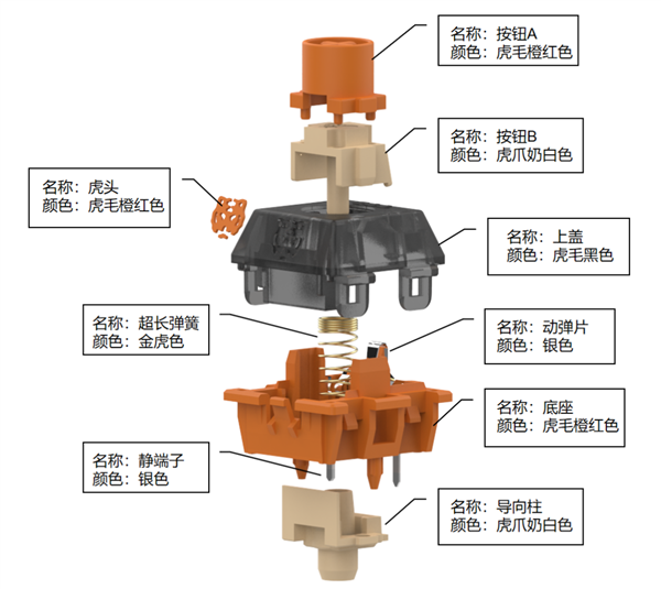 TTC虎轴整体采用老虎身上的配色,按钮导向轴以及底座导向柱采用奶白色,上盖为半透明黑色。在轴体上盖的另一面,还印有古汉字“壬寅”,代表2022农历年的天干地支。