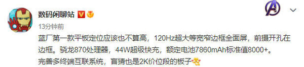 1月19日,数码博主@数码闲聊站 曝光了关于vivo首款平板的信息。据他爆料,vivo第一款平板定位不算高,配备了一块120Hz超大宽窄边框全面屏,前摄开孔在边框上。平板搭载了骁龙870移动平台,支持44W超级闪充,额定电池容量为7860mAh,标准值超过8000mAh。从这些数据来看,vivo首款平板配置还是不错的。